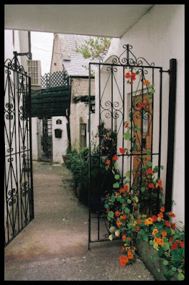 A fabulous weather boarded house with porch and veranda, a top floor containing windows with shutters, some brick masonry and beautifully overgrown with various trees and plants. It's an absolute delight and somewhere I would love to live...after it's been renovated, of course. :)